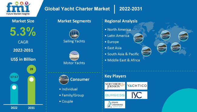 The global yacht charter market is estimated to reach a valuation of US$ 28 Billion by 2031 progressing at a healthy CAGR of 5.3% (2022-2031). The market is expected to be worth US$ 17.57 Billion in 2022.