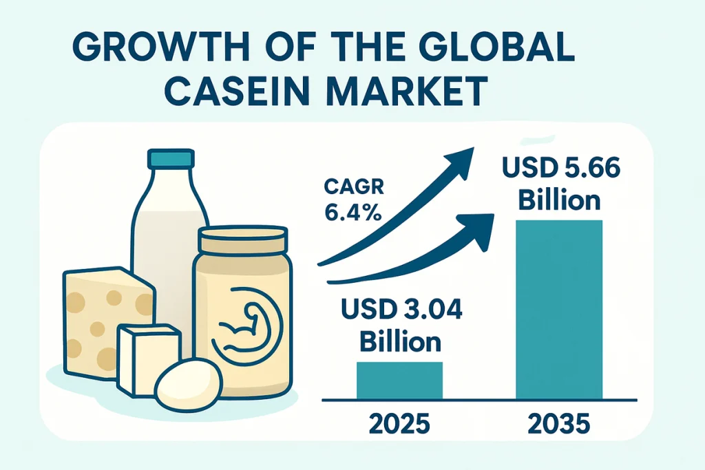 The global casein market is projected to grow significantly, rising from USD 3.04 billion in 2025 to an estimated USD 5.66 billion by 2035, marking a robust CAGR of 6.4% during the forecast period. Casein’s appeal lies in its high nutritional value and slow-digesting properties, which have fueled its adoption in sports nutrition, functional foods, and clinical nutrition. The market’s continued expansion is underpinned by rising health consciousness, protein-enriched diets, and increased usage in the food & beverage sector.