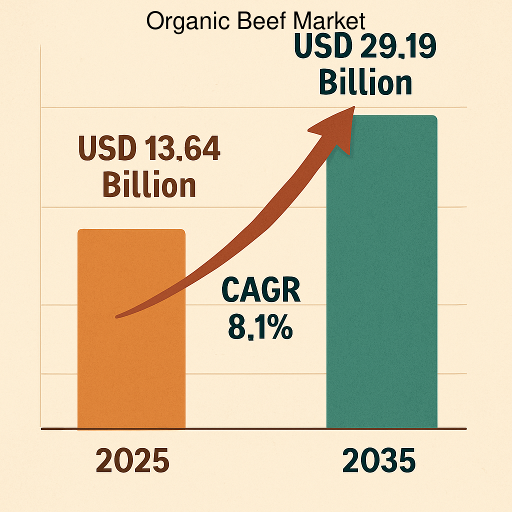 The global organic beef market is on an impressive upward trajectory, expected to more than double in value between 2025 and 2035, USD 13.64 billion by 2025 and is projected to reach a value of USD 29.19 billion by 2035, reflecting a CAGR of 8.1%. This growth is being propelled by consumers’ rising preference for clean‑label proteins, stronger regulatory support for sustainable farming, and heightened awareness of antibiotic resistance and animal welfare. Organic beef is rapidly cementing its place within the premium protein segment, especially in high‑income economies where ethical sourcing and environmental stewardship drive purchase decisions.