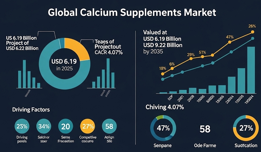 - Consistent Market Expansion: The global calcium supplements market is set for steady growth, with a projected increase from USD 6.19 billion in 2025 to USD 9.22 billion by 2035.