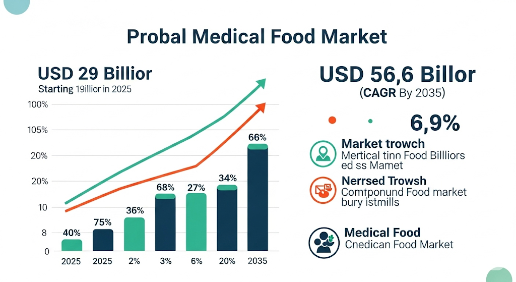 According to Future Market Insights, the medical foods market is projected to grow from USD 29 billion in 2025 to USD 56.6 billion by 2035, reflecting a steady CAGR of 6.9%North America holds a dominant share of around 32%, with demand being driven by a rise in lifestyle diseases such as diabetes, cancer, and chronic kidney disorders. FMI also highlights the increasing role of hospitals, home healthcare, and institutional settings as key channels for medical food delivery.