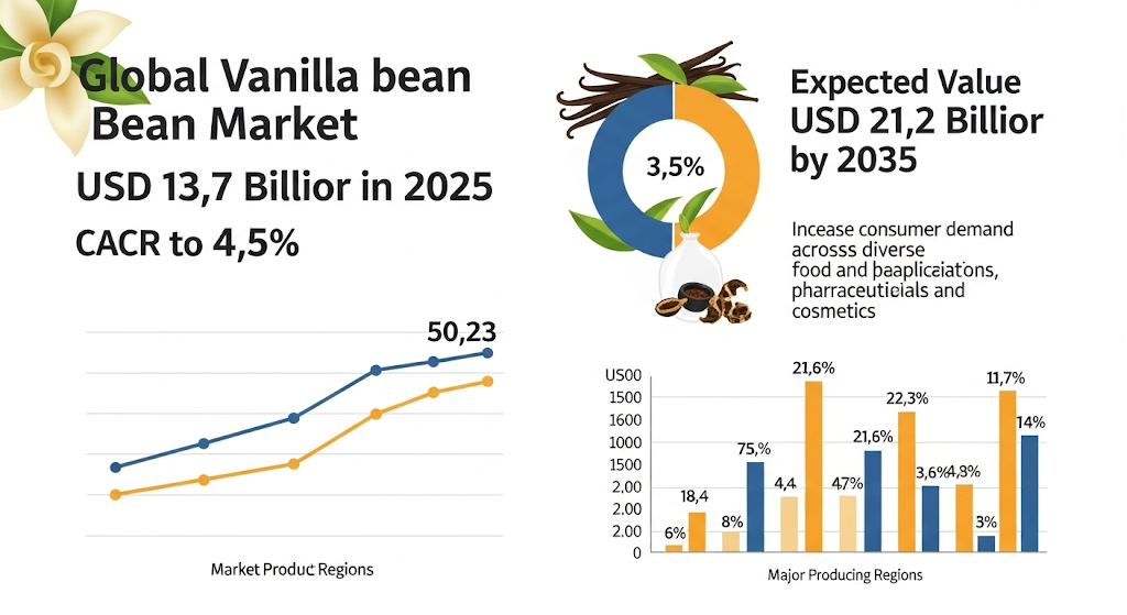 The global vanilla bean market is heating up—and not just in kitchens. According to Future Market Insights (FMI), the industry was valued at USD 13.7 billion in 2025 and is projected to reach USD 21.2 billion by 2035, growing at a CAGR of 4.5%. This upward curve is powered by soaring demand for natural flavoring, plant-based ingredients, and clean-label products—especially in gourmet food, cosmetics, and pharmaceuticals.