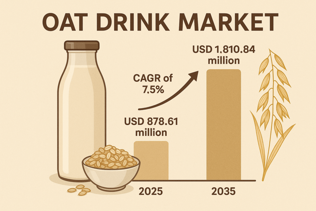 The global oat drink market is poised for significant expansion, with its valuation projected to rise from USD 878.61 million in 2025 to USD 1,810.84 million by 2035, growing at a compound annual growth rate (CAGR) of 7.5%. This rapid growth is fueled by increasing consumer demand for plant-based, lactose-free, and allergen-friendly dairy alternatives, driven by health, sustainability, and lifestyle trends globally.