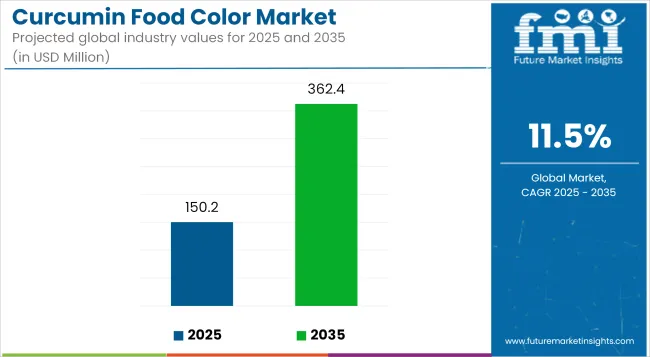 The curcumin food color market is poised for significant expansion, projected to grow from USD 150.2 million in 2025 to USD 362.4 million by 2035, at a CAGR of 11.5%. The growing preference for natural and clean-label food additives, rising health awareness, and increasing regulatory scrutiny of synthetic colorants are key factors driving this shift. As a natural extract from turmeric, curcumin is gaining wide appeal in food and beverage applications due to its vibrant color and antioxidant benefits.