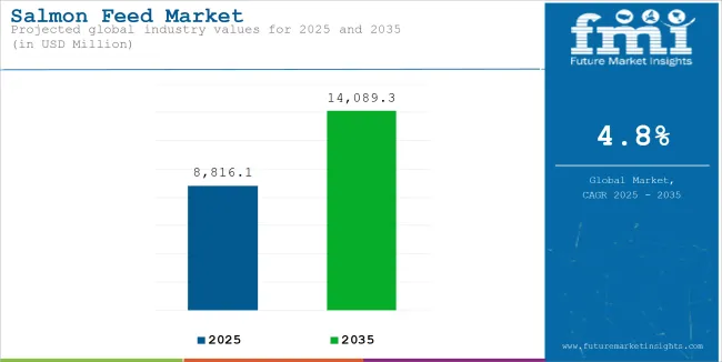According to Future Market Insights, the global salmon feed market is projected to grow from USD 8.8 billion in 2025 to USD 14.1 billion by 2035, expanding at a compound annual growth rate (CAGR) of 4.8% over the forecast period (Future Market Insights).