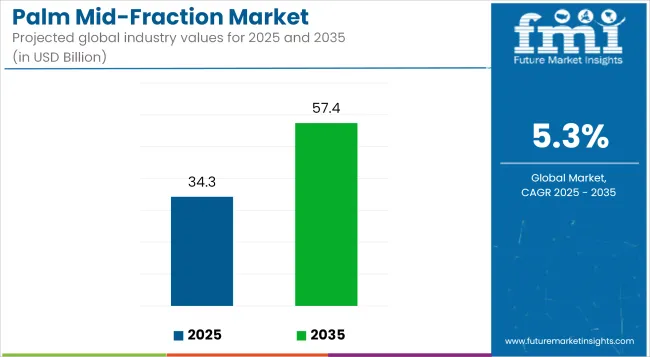 The global Palm Mid-Fraction (PMF) market is poised for significant expansion, projected to rise from USD 34.25 billion in 2025 to USD 57.40 billion by 2035, growing at a CAGR of 5.3%. This growth is fueled by increased applications in bakery, confectionery fats, and specialty lipid formulations, along with a surge in demand for cocoa butter alternatives. With evolving food processing trends and innovative fat technologies, PMF continues to gain traction across global markets.