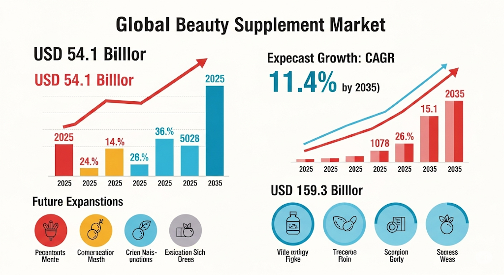 The global beauty supplement market is undergoing a transformation fueled by the convergence of beauty and wellness, rising consumer awareness, and innovations in ingestible skincare. Valued at USD 54.1 billion in 2025, the market is expected to expand significantly to USD 159.3 billion by 2035, growing at a CAGR of 11.4%. With increasing demand for natural, science-backed, and multi-functional beauty solutions, this segment is evolving rapidly across regions and demographics.