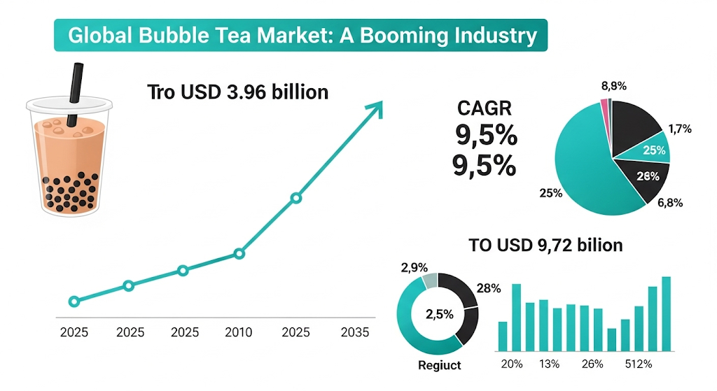 Once a street-side curiosity in Taiwanese night markets, bubble tea has gone global—and now, it’s big business. According to Future Market Insights, the global bubble tea market, valued at USD 3.96 billion in 2025, is projected to reach USD 9.72 billion by 2035, expanding at a rapid compound annual growth rate (CAGR) of 9.5%.