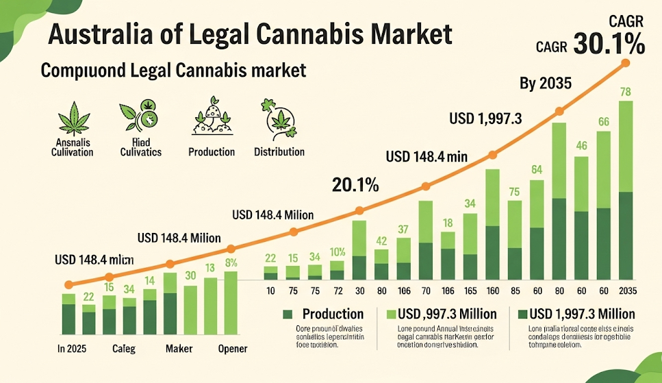 According to a report by Future Market Insights (FMI), the legal cannabis market in Australia is projected to skyrocket from USD 148.4 million in 2025 to nearly USD 2 billion by 2035, representing a staggering compound annual growth rate (CAGR) of 30.1%. That’s not just a bullish outlook—it’s a wake-up call.