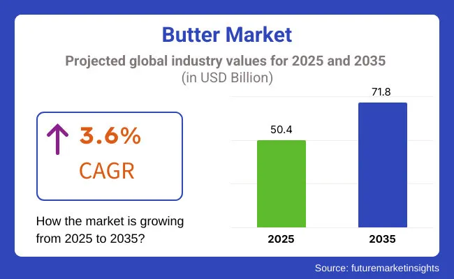 According to Future Market Insights, the global butter market is expected to reach USD 50.4 billion in 2025 and surge to USD 71.8 billion by 2035, reflecting a compound annual growth rate (CAGR) of 3.6% over the forecast period. This growth, while steady, signals more than just economic movement—it marks butter’s stubborn relevance in a changing food economy.