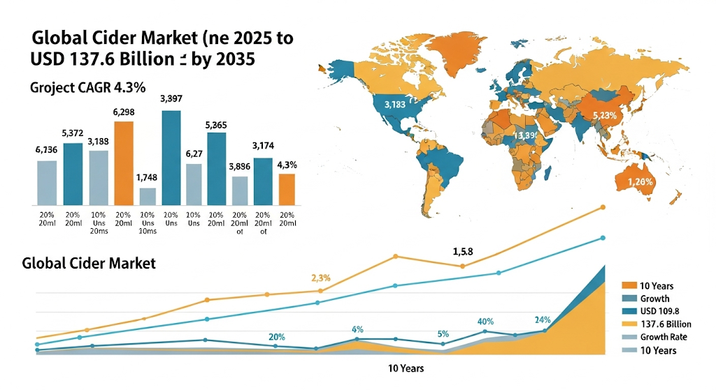 - Market Size Projection: The cider market is projected to grow at a CAGR of 4.3% between 2025 and 2035, reaching USD 137.6 billion.