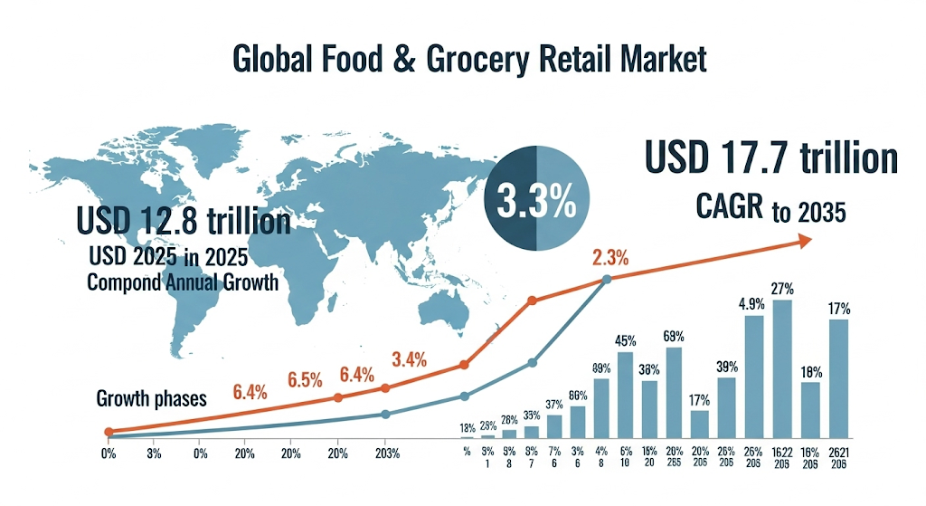 According to Future Market Insights, the global food and grocery retail market is set to grow from USD 12.8 trillion in 2025 to USD 17.7 trillion by 2035, reflecting a compound annual growth rate (CAGR) of 3.3% over the next decade. While that growth sounds reassuring, it obscures a far more complicated reality: power is consolidating, small players are disappearing, and the very nature of food access is being rewritten.