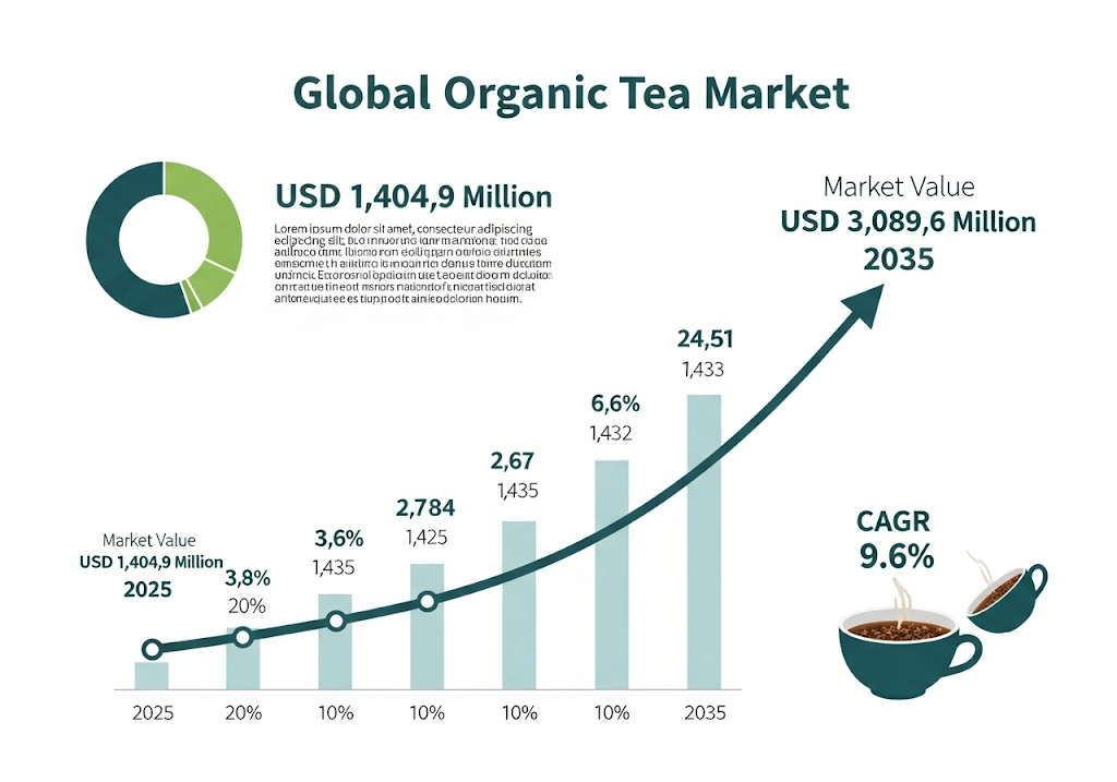 The global organic tea market is poised for remarkable growth, with projections indicating an increase from USD 1,404.9 million in 2025 to USD 3,089.6 million by 2035, growing at a robust CAGR of 9.6%. The surge is being driven by a rising wave of health awareness, consumer demand for natural products, and a broader societal shift toward sustainable and ethical consumption.