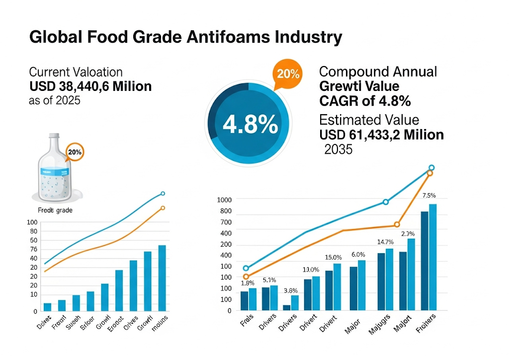 The global food grade antifoams market, valued at approximately USD 38,440.6 million in 2025, is projected to grow at a CAGR of 4.8% to reach USD 61,433.2 million by 2035, according to Future Market Insights. This robust growth is propelled by the rising need for operational efficiency in food manufacturing and increasing consumer preference for clean-label and sustainable food processing ingredients.