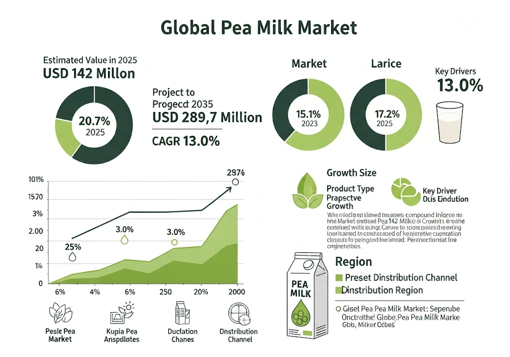 The global pea milk market is witnessing significant momentum as consumer demand for sustainable, nutritious, and allergen-friendly dairy alternatives continues to rise. Estimated at USD 142 million in 2025, the market is forecast to more than double, reaching USD 289.7 million by 2035, driven by a robust CAGR of 13.0%. Key drivers include health awareness, lactose intolerance, vegan dietary preferences, and environmental concerns, positioning pea milk as a leading option in the plant-based beverage sector.