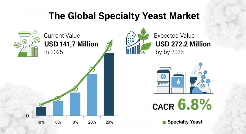 The global specialty yeast market is poised for strong expansion, growing from USD 141.7 million in 2025 to USD 272.2 million by 2035 at a CAGR of 6.8%. This growth is propelled by increasing demand for natural, clean-label ingredients across food, beverage, cosmetics, and pharmaceutical industries. The market is also benefiting from the surging popularity of plant-based and functional foods, precision fermentation technologies, and robust R&D investments in biotechnology.