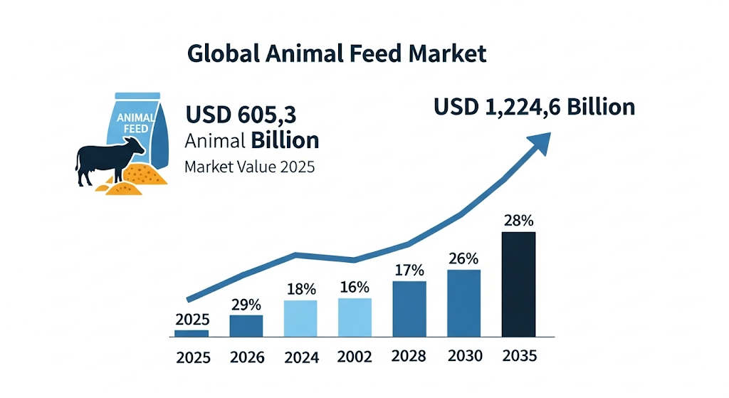 The global animal feed market is poised for strong growth, expected to surge from USD 605.3 billion in 2025 to USD 1,224.6 billion by 2035. This expansion—reflected in a robust CAGR of 7.3%—is fueled by heightened demand for animal protein, rapid livestock industrialization, and evolving government-backed food security strategies. Across key regions, advancements in feed technology and a shift toward nutrient-specific formulations are shaping the future of animal nutrition.