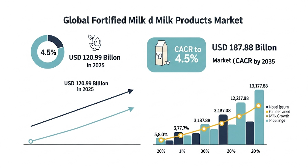 The global fortified milk and milk products market is poised for consistent growth, with projections estimating the market will grow from USD 120.99 billion in 2025 to USD 187.88 billion by 2035, reflecting a compound annual growth rate (CAGR) of 4.5%. This upward trajectory is driven by increasing consumer awareness of health and preventive nutrition, backed by strong government initiatives, technological advancements in food fortification, and rising demand across developing and developed nations alike.