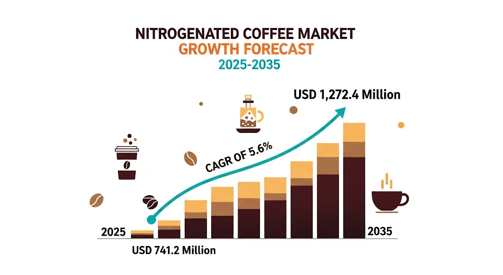The global nitrogenated coffee market is expected to witness robust growth, expanding from USD 741.2 million in 2025 to USD 1,272.4 million by 2035, registering a CAGR of 5.6%. This surge is primarily driven by the growing consumer appetite for innovative, texture-enhanced coffee beverages and a rising preference for ready-to-drink (RTD) formats. As premiumization trends continue to shape the beverage industry, nitrogenated coffee stands out for its smooth mouthfeel and visually appealing presentation.