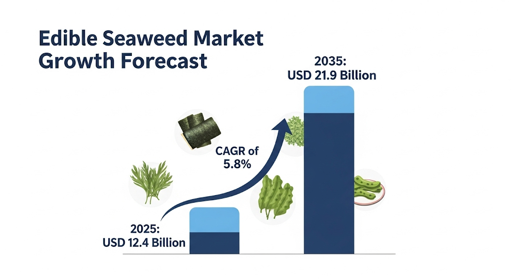The global edible seaweed market is witnessing robust expansion, projected to grow from USD 12.4 billion in 2025 to USD 21.9 billion by 2035. This growth, driven by a steady 5.8% CAGR, reflects increasing consumer preference for plant-based, nutrient-rich, and sustainable food products. Edible seaweed’s health benefits, culinary versatility, and low environmental impact are positioning it as a key player in the future of functional and sustainable food consumption.