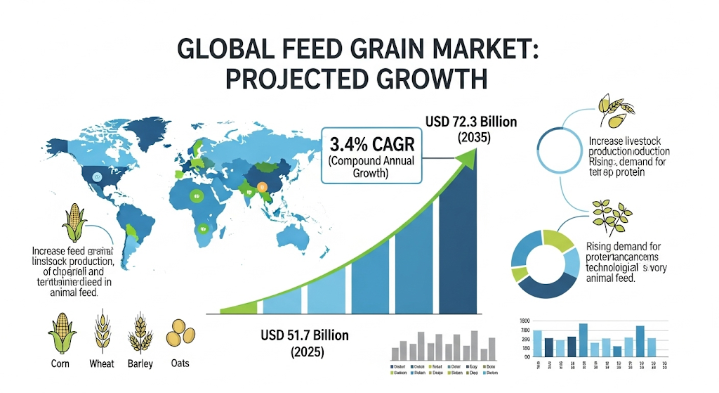 - Global feed grain market to reach USD 72.3 billion by 2035.
