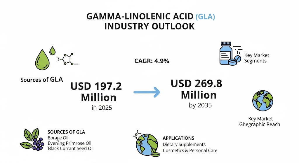 According to Future Market Insights (FMI), the global GLA industry is projected to grow from USD 197.2 million in 2025 to USD 269.8 million by 2035, reflecting a compound annual growth rate (CAGR) of 4.9%. This trend underscores a market that may not be explosive, but is steadily carving out a valuable niche in the functional lipid category.
