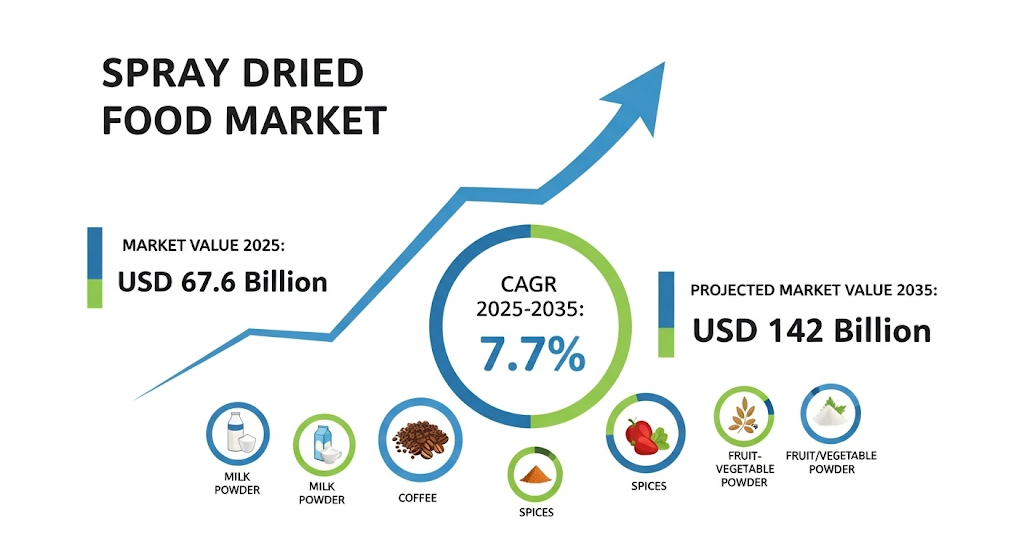 The global spray dried food market, valued at USD 67.6 billion in 2025, is set to nearly double, reaching USD 142 billion by 2035, registering a steady CAGR of 7.7%. This remarkable growth trajectory is supported by the rising demand for convenient, functional, and nutritionally rich food products, alongside technological advancements in food processing. Key contributors include the surging popularity of nutraceuticals, dietary supplements, and dairy-based powders, which continue to dominate the global landscape.