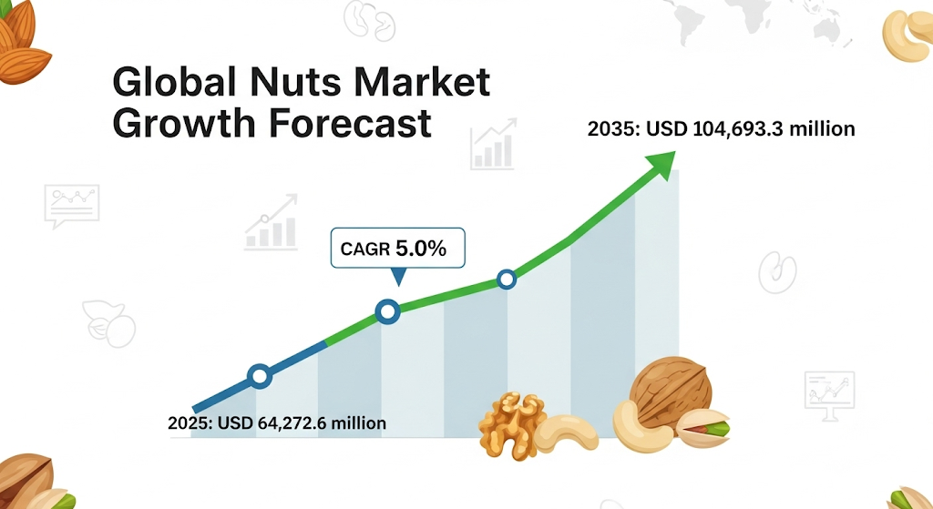 The global nuts market is on a fast track to expansion. According to Future Market Insights (FMI), the market is projected to surge from USD 64.27 billion in 2025 to USD 104.69 billion by 2035, marking a 5.0% CAGR over the decade. That’s not just growth—it’s a clear indicator of a global shift in how we eat, snack, and fuel our bodies.
