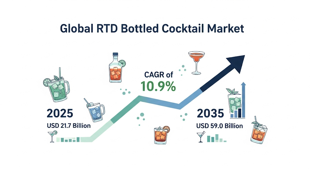 The global ready-to-drink (rtd) bottled cocktail market is on a robust growth trajectory, projected to rise from USD 21.7 billion in 2025 to USD 59.0 billion by 2035, reflecting a compound annual growth rate (CAGR) of 10.9%. This significant expansion is fueled by a dynamic shift in consumer behavior—particularly a preference for convenient, premium-quality alcoholic beverages that align with modern social trends, such as at-home entertaining and digital-first purchasing experiences.
