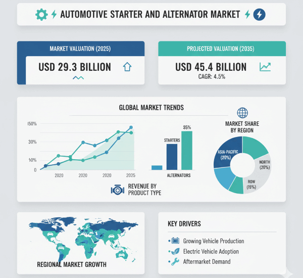 The Automotive Starter and Alternator Market is poised for significant expansion over the next decade, with its valuation expected to grow from USD 29.3 billion in 2025 to USD 45.4 billion by 2035, registering a steady CAGR of 4.5%. This growth reflects a dynamic transformation within the automotive ecosystem—driven by electrification trends, stricter emission norms, and heightened demand for performance and reliability in both traditional and hybrid vehicles.