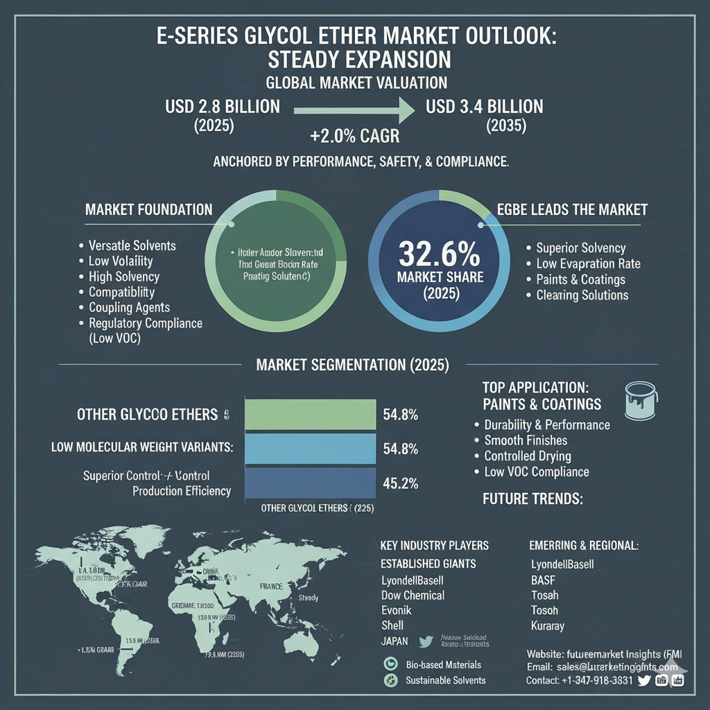 The global E-Series Glycol Ether Market is poised for steady but meaningful growth over the next decade, underpinned by rising demand in paints, coatings, cleaning agents, and industrial chemicals. Valued at USD 2.8 billion in 2025, the market is projected to reach USD 3.4 billion by 2035, reflecting a compound annual growth rate (CAGR) of 2.0%. While this growth trajectory is moderate compared to other specialty chemical segments, the market’s consistency highlights its essential role in multiple industries and its ability to adapt to regulatory, environmental, and performance-driven demands.