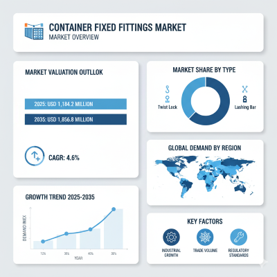 The latest report titled “Container Fixed Fittings Market Analysis – Size, Share, and Forecast Outlook 2025 to 2035” reveals that the global container fixed fittings market is valued at USD 1,184.2 million in 2025 and is forecasted to reach USD 1,856.8 million by 2035, expanding at a CAGR of 4.6% during the forecast period. This translates to a 56.8% total growth, highlighting the industry’s consistent expansion supported by surging containerized trade, standardized handling systems, and increasing adoption of durable and smart container fittings.