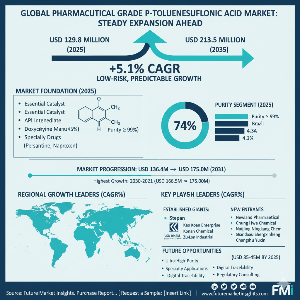 The pharmaceutical grade P-toluenesulfonic acid market is poised for a decade of steady expansion. Valued at USD 129.8 million in 2025, the market is forecast to reach USD 213.5 million by 2035, reflecting a compound annual growth rate (CAGR) of 5.1%. This trajectory illustrates not only consistent year-on-year growth but also a rare stability in an era where many chemical markets face volatility. From USD 136.4 million in 2026 to USD 175.0 million in 2031, the progression underscores a low-risk and predictable pathway for industry stakeholders.