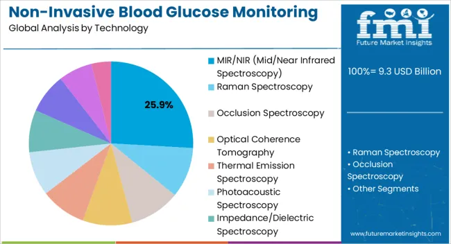 The MIR/NIR (Mid/Near Infrared Spectroscopy) segment is expected to lead with a 25.9% share in 2025, leveraging light absorption patterns to detect glucose levels painlessly. With continuous refinements in calibration algorithms, MIR/NIR technology is emerging as one of the most commercially viable solutions, particularly for wearable applications.