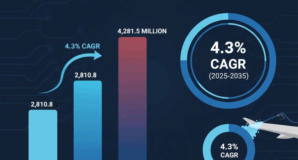 The global aircraft cleaning chemicals market is on the brink of substantial growth, projected to expand from USD 2,810.8 million in 2025 to USD 4,281.5 million by 2035, at a CAGR of 4.3%. Increasing air traffic, stricter hygiene regulations, and sustainability initiatives are driving demand for high-performance cleaning solutions across commercial aviation sectors.