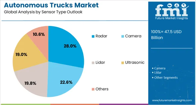 Diesel propulsion dominates the autonomous truck market, accounting for 65% of the market in 2025. Diesel engines’ proven reliability, long-range capabilities, and established fueling infrastructure make them ideal for long-haul freight operations. Heavy duty trucks represent 55% of the vehicle type segment, reflecting the primary application of autonomous systems in long-haul logistics. Radar sensors lead the sensor segment with a 28% share, offering dependable object detection and distance measurement, critical for safe autonomous driving.