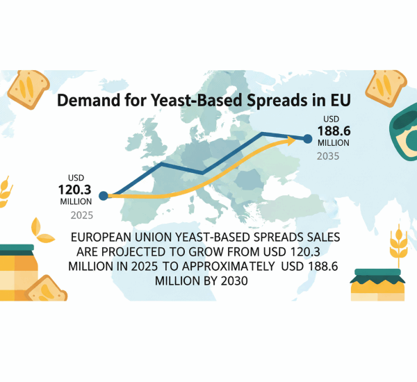 According to Future Market Insights’ latest report, “Demand for Yeast-Based Spreads in EU: Outlook and Forecast (2025–2035),” the European Union yeast-based spreads market is projected to expand from USD 120.3 million in 2025 to approximately USD 188.6 million by 2035, representing an absolute increase of USD 67.5 million and a CAGR of 4.6% over the forecast period. The market is expected to grow 1.56 times its current size as consumers across Germany, France, Italy, and other key European regions show rising interest in vitamin-rich, umami-flavored, and sustainable food options.
