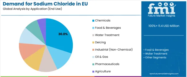 The chemical industry continues to anchor sodium chloride consumption, commanding approximately 30% of total EU demand in 2025. Sodium chloride remains indispensable in chlor-alkali electrolysis, where it serves as the base material for chlorine, caustic soda, and hydrogen — essential inputs for plastics, solvents, and pharmaceutical intermediates.