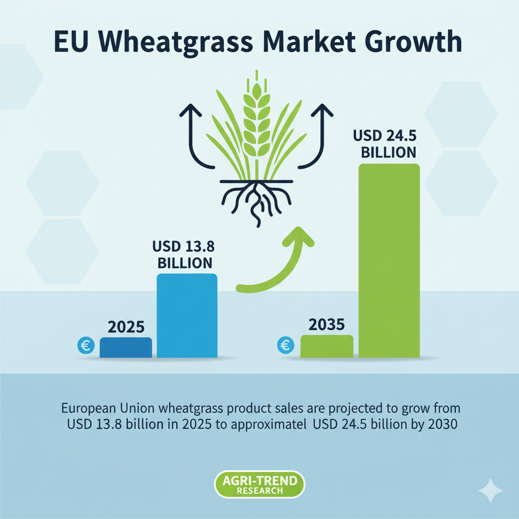 The wheatgrass revolution is advancing across Europe. According to the latest report, “Demand for Wheatgrass Products in EU: Outlook and Forecast (2025–2035)”, sales of wheatgrass products in the European Union are projected to climb from USD 13.8 billion in 2025 to USD 24.5 billion by 2035, representing an impressive absolute value increase of USD 10.7 billion and a strong 5.9% CAGR. The market is on track to expand by nearly 1.8X over the next decade, supported by a surge in consumer awareness of superfood nutrition, wider product availability, and innovation led by both longstanding market leaders and new entrants.