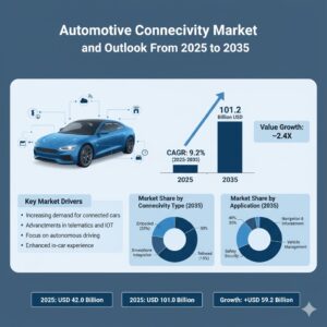 The global automotive connectivity market is accelerating into a transformative decade, redefining how vehicles communicate, operate, and enhance human mobility. Valued at USD 42.0 billion in 2025, the market is expected to reach USD 101.2 billion by 2035, expanding at a robust CAGR of 9.2%. This projection marks a 2.4X increase from 2024’s valuation of USD 38.4 billion, underscoring the rapid adoption of connected technologies that are reshaping the future of transportation.