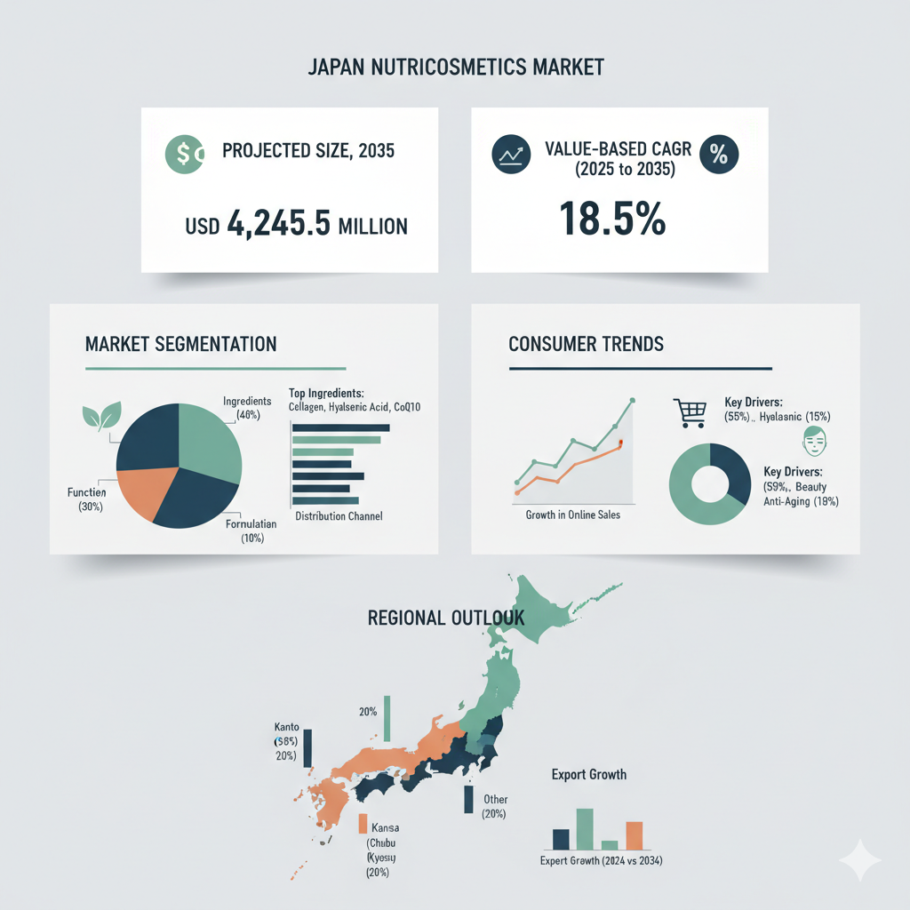Japan’s nutricosmetics market is entering a new era of rapid growth, innovation, and global influence. With market value projected to surge from USD 790.1 million in 2025 to over USD 4.2 billion by 2035, the industry is opening vast opportunities for both seasoned manufacturers and ambitious new entrants eager to redefine beauty and wellness through nutrition and science.
