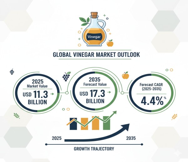 The global vinegar market, valued at USD 11.3 billion in 2025, is projected to reach USD 17.3 billion by 2035, registering a healthy CAGR of 4.4%. Driven by increasing demand across food, health, personal care, and household segments, vinegar continues to establish itself as a versatile, functional, and natural ingredient.