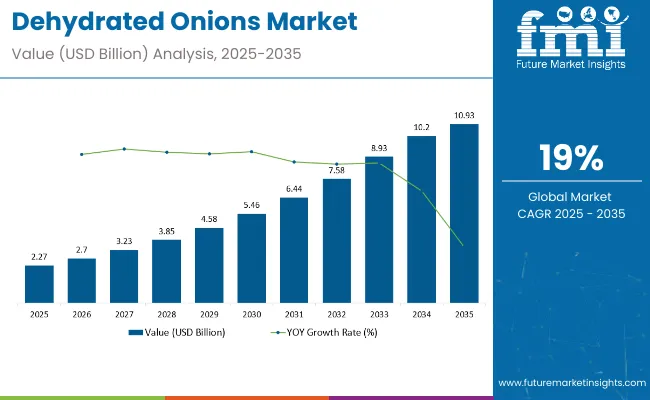 The global dehydrated onions market is poised for substantial growth, expanding from USD 2.27 billion in 2025 to an estimated USD 10.93 billion by 2035. This reflects a robust compound annual growth rate (CAGR) of 19%, driven by the rising demand for convenience foods, processed meals, and ready-to-cook solutions. India is currently the largest contributor to the market, leveraging its cost-competitive supply chain, robust agricultural infrastructure, and significant role in global onion exports.