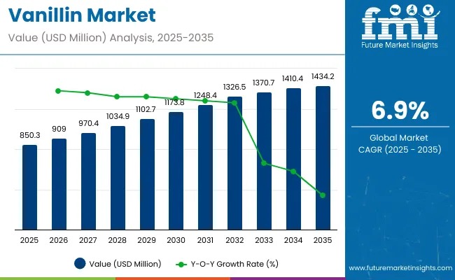The global vanillin market is poised for steady expansion, with the industry valued at USD 850.3 million in 2025 and projected to reach USD 1,434.2 million by 2035, reflecting a total growth of 68.7% and an absolute increase of USD 583.9 million. The market is forecast to expand at a 6.9% CAGR during the assessment period, with demand fueled by the rising consumption of flavored foods, growing preference for clean-label ingredients, and expanded applications across pharmaceuticals and cosmetics.