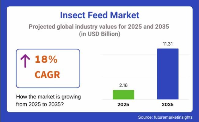 The global insect feed market, currently valued at around USD 2.16 billion, is on track to reach USD 11.31 billion by 2035 at a strong CAGR of 18%. The surge in adoption reflects the accelerating shift toward circular, sustainable, and resource-efficient animal nutrition systems.