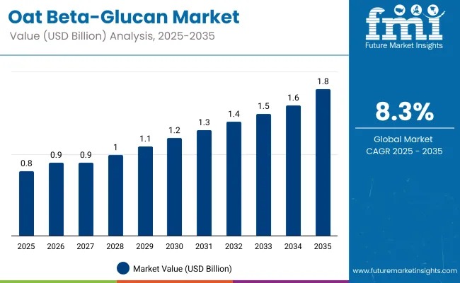 The global oat beta-glucan market is projected to grow from USD 0.8 billion in 2025 to USD 1.8 billion by 2035, registering a robust CAGR of 8.3% over the forecast period. Rising consumer awareness of heart health, cholesterol management, and gut wellness is fueling demand for this soluble dietary fiber across food, beverage, and nutraceutical applications.