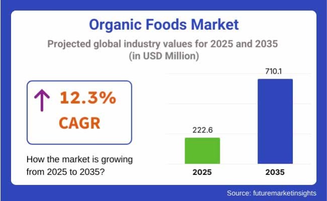 The organic foods market is gaining strong traction as consumers shift away from conventional products toward health-centric, sustainable, and pesticide-free alternatives. According to recent projections, the industry is estimated to be valued at USD 222.6 million in 2025 and is expected to reach USD 710.1 million by 2035, expanding at a robust CAGR of 12.3% from 2025 to 2035.
