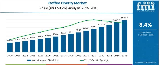 The Coffee Cherry market is on a robust growth trajectory, with its valuation projected to rise from USD 699.6 million in 2025 to USD 1,567.3 million by 2035, reflecting a compound annual growth rate (CAGR) of 8.4%. Driven by increasing consumer awareness of health and wellness, alongside the demand for natural and sustainable ingredients, the market is experiencing widespread adoption across personal care, functional foods, and nutraceutical applications.