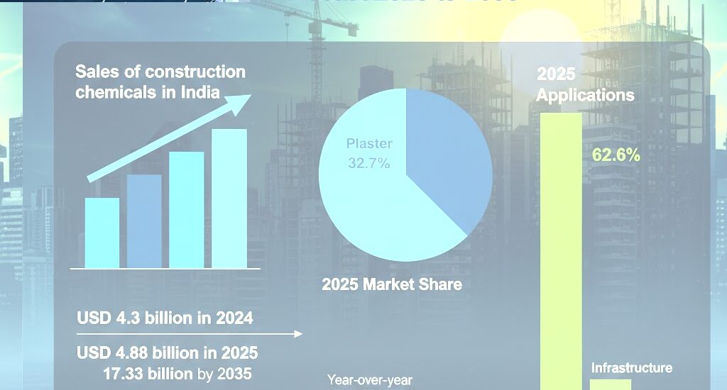 According to Future Market Insights (FMI), India’s construction chemical industry is poised for remarkable expansion, surging from USD 4.88 billion in 2025 to USD 17.33 billion by 2035, registering a robust CAGR of 13.4%. This acceleration underscores India’s pivotal role in the global construction chemicals landscape, influencing material supply and innovation trends across APAC, Europe, the USA, and Saudi Arabia.
