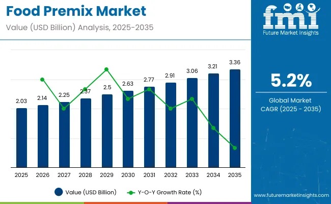 The global food premix market is valued at USD 2.03 billion in 2025 and is projected to reach USD 3.36 billion by 2035, expanding at a CAGR of 5.2%. Rising attention toward nutrient deficiencies, immunity needs, and chronic health risks is accelerating demand for fortified foods and dietary supplements.